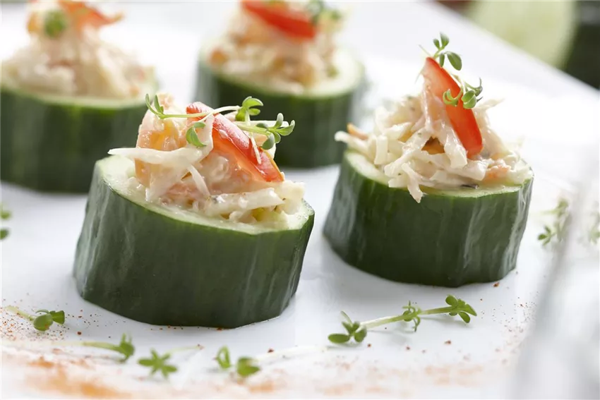 Die Gurken, Zwiebeln, Tomaten und Paprika in eine Schüssel geben und die Sauce darüber gießen, dann alles vermengen. Den Mozzarella in Stücke schneiden und über den Salat geben. Die ausgehöhlten Gurkenscheiben auf einen Teller legen, mit dem Salat füllen und mit etwas Gartenkresse bestreuen.