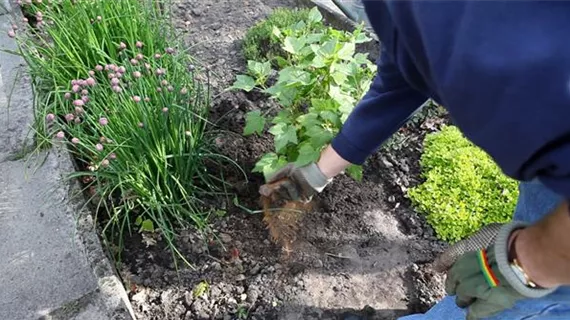 Lockern Sie nun den Wurzelballen ein wenig auf und setzen Sie den Johannisbeerstrauch mittig in das vorbereitete Pflanzloch ein. Anschließend füllen Sie es mit Erde auf und treten Sie den Boden fest.