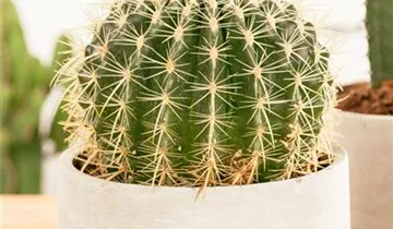 Die Triebe von Echinocactus grusonii sind bedornt.