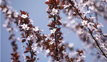 Die Blutpflaume 'Nigra' (Prunus cerasifera) ist ein rundlicher, malerischer Kleinbaum mit dekorativen, dunkelroten, runden Früchten. Die rosafarbenen, schalenförmigen Blüten erscheinen von März bis April.
