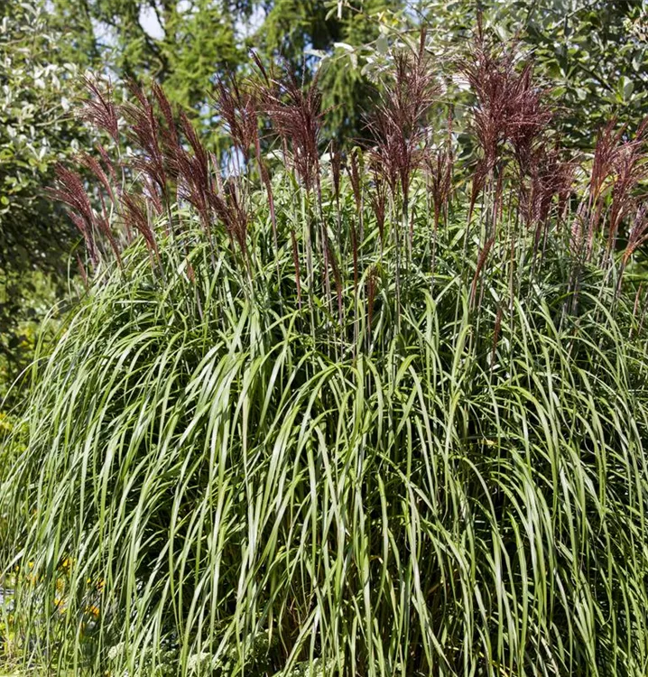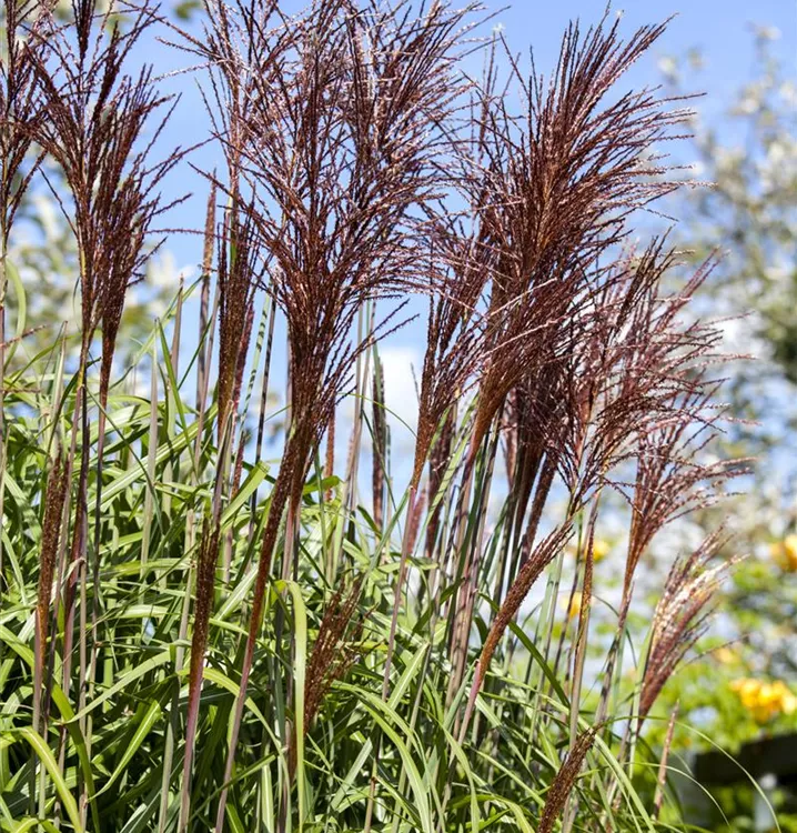 Das Garten-Chinaschilf (Miscanthus sinensis) ist mit seiner mittelgrünen Blattfärbung ein dekoratives Gestaltungselement im Garten, welches sich an einem sonnigen bis halbschattigen Standort mit einem möglichst durchlässigen, humosen, nährstoffreichen Boden am wohlsten fühlt. Die cremeweißen bis braunen Blütenwedel schmücken die aufrecht wachsende Pflanze ab Herbst. Bei günstigen Bedingungen erreicht dieses winterharte Gras eine Höhe von ca. 1,2 m und wird bis zu 80 cm breit.