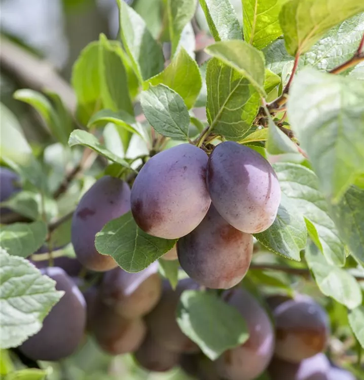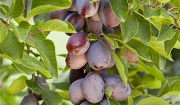 Die Zwetschge (Prunus domestica) bildet purpurviolette, blaue Früchte. Sie haben einen süßen, aromatischen Geschmack. Für eine ertragreiche Ernte ab Juli schaffen durchlässiger, humoser Boden und ein sonniger bis halbschattiger Standort optimale Bedingungen. Auch ihre weißen Blüten sind eine schöne Erscheinung.