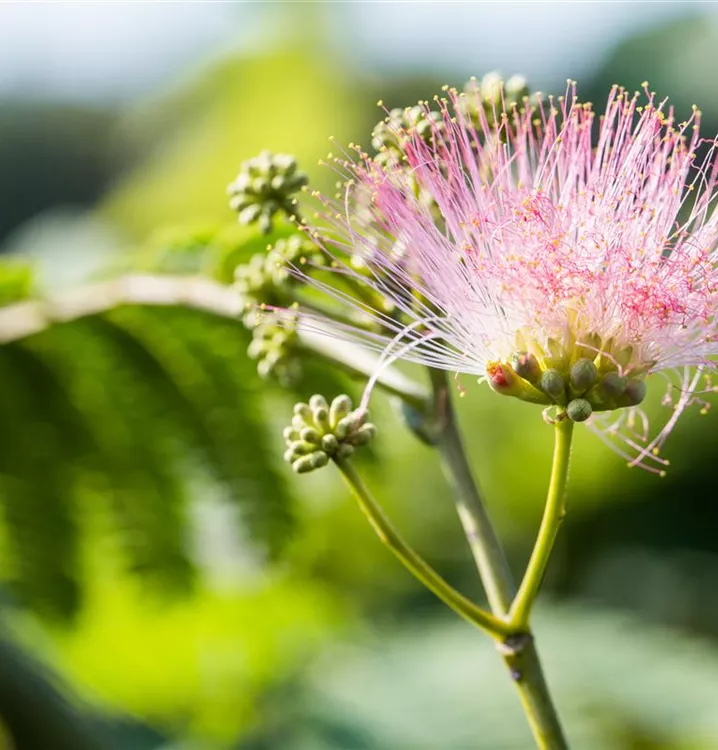 Der Seidenbaum (Albizia julibrissin) eine rundliche Gartenpflanze, die, je nach Sorte, Blüten in verschiedenen Farben hervorbringt. An einem sonnigen, windgeschützten Standort mit durchlässigem Boden erreicht er gewöhnlich eine Höhe von ca. 6 m und wird ca. 6 m breit.