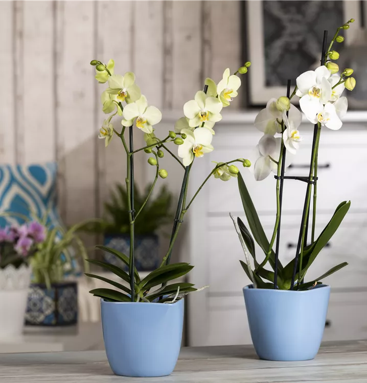 Die Schmetterlingsorchidee (Phalaenopsis) ist eine schöne, in verschiedenen Farben blühende Orchidee. Ihre lippenförmigen Blüten sind sehr dekorativ und erscheinen in Rispen von Januar bis Dezember. Für das optimale Wachstum sorgen ein heller Standort sowie ein spezielles Orchideen-Substrat.