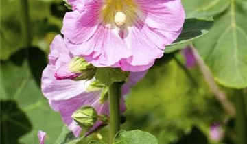 Die sommergrünen Blätter der Stockrose sind mittelgrün, rundlich, gelappt.