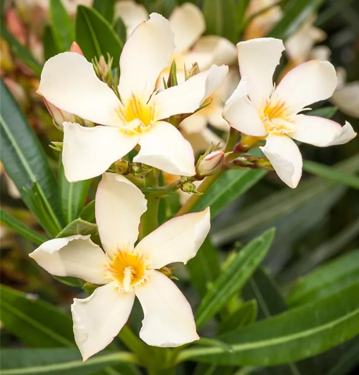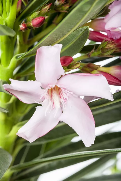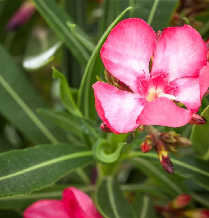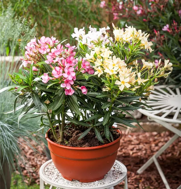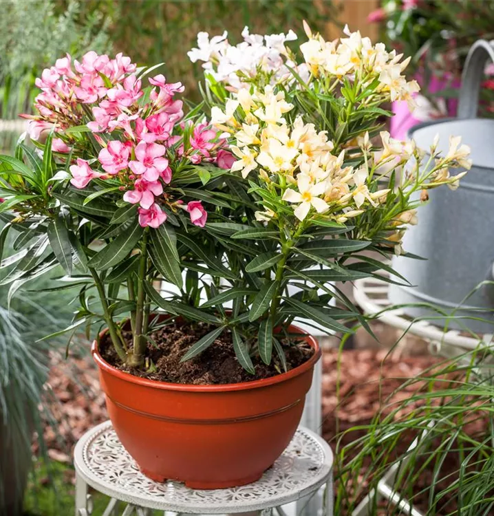 Der Oleander (Nerium oleander) ist eine sehr beliebte Kübelpflanze. Seine dekorativen Blüten erscheinen von Juni bis September. Verwenden Sie bevorzugt die spezielle Kübelpflanzenerde, denn sie verdichtet sich über längere Zeit nicht.