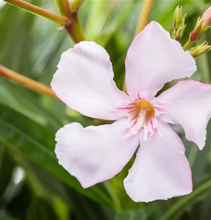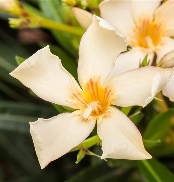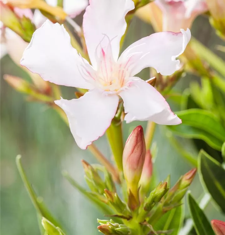 Die immergrünen Blätter des Oleanders sind dunkelgrün, lanzettlich.