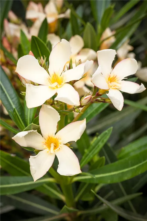 Nerium oleander, gelb bildet während der gesamten Saison zahlreiche gelbe Blüten.