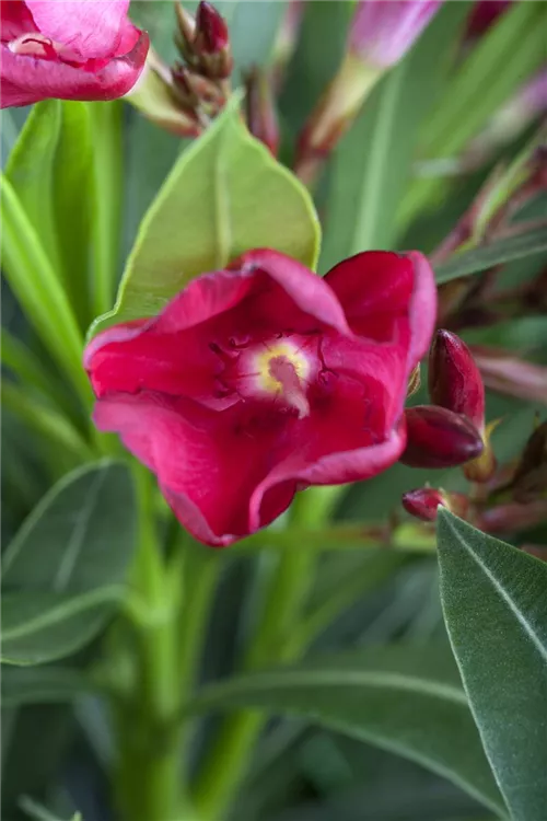 Nerium oleander, rot bildet während der gesamten Saison zahlreiche rote Blüten.