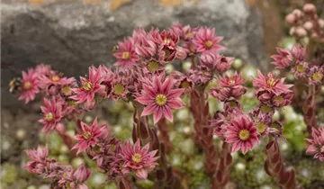 Sempervivum arachnoideum bildet karminrote Blüten ab Juni.