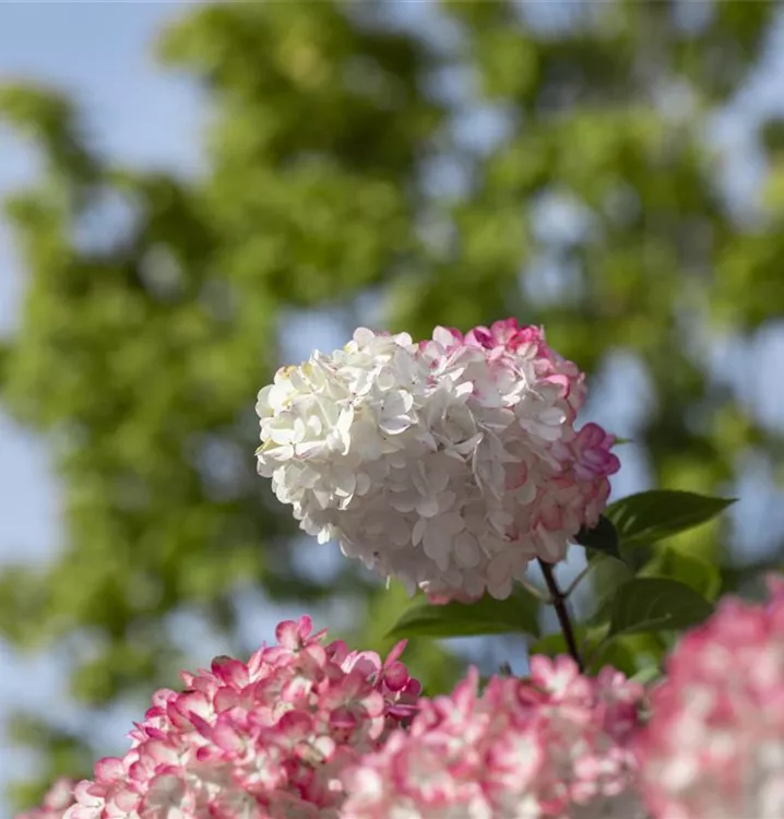 Die Rispenhortensie 'Vanille Fraise'® (Hydrangea paniculata) ist ein aufrechter Strauch, der weiße, später rosafarbene, in Rispen angeordnete Blüten mit einem angenehmen Duft hervorbringt. Sie erscheinen von Juli bis September. An einem sonnigen bis halbschattigen Standort mit durchlässigem, humosem Boden erreicht sie gewöhnlich eine Höhe von ca. 2 m und wird ca. 1,5 m breit.