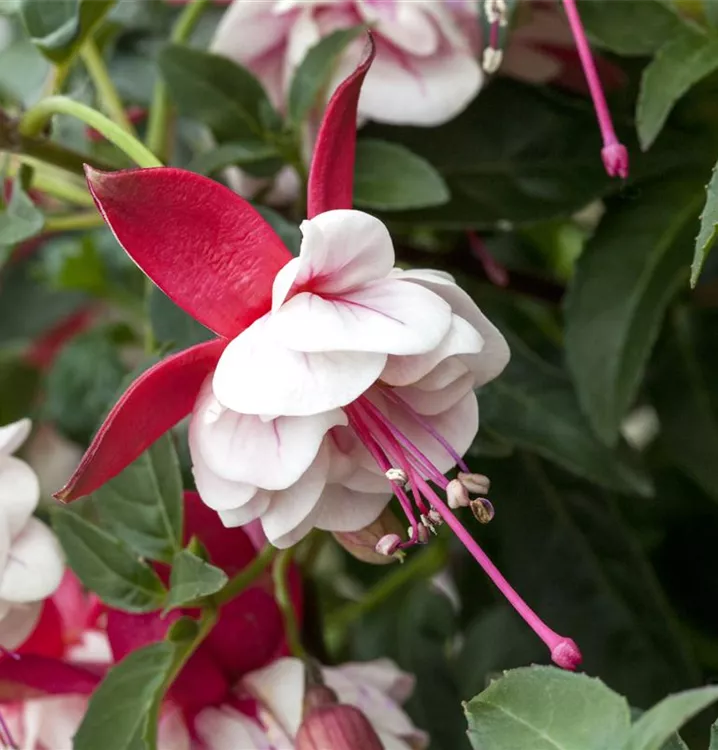 Fuchsia 'Jollies'® bildet während der gesamten Saison zahlreiche glockenförmige, zweifarbige Blüten.