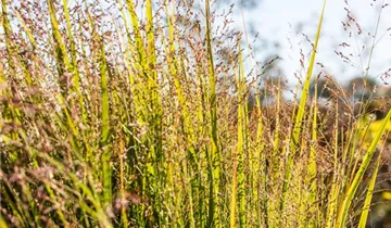 Die Ruten-Hirse (Panicum virgatum) ist mit ihrer mittelgrünen Blattfärbung ein dekoratives Gestaltungselement im Garten, welches sich an einem sonnigen Standort mit einem möglichst durchlässigen, humosen, lockeren Boden am wohlsten fühlt. Die grünen Blütenwedel schmücken die horstbildend und trichterförmig wachsende Pflanze ab Sommer. Bei günstigen Bedingungen erreicht dieses winterharte Gras eine Höhe von ca. 2,5 m und wird bis zu 1 m breit.