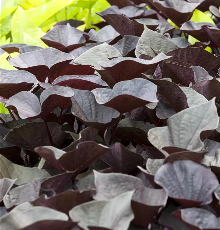 Süßkartoffel ist ein kriechend wachsendes Klettergehölz, welches eine Höhe von 1,5 - 2 m und eine Breite von 0,5 - 1 m erreichen kann.